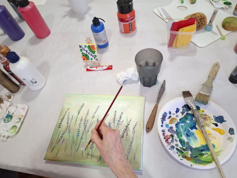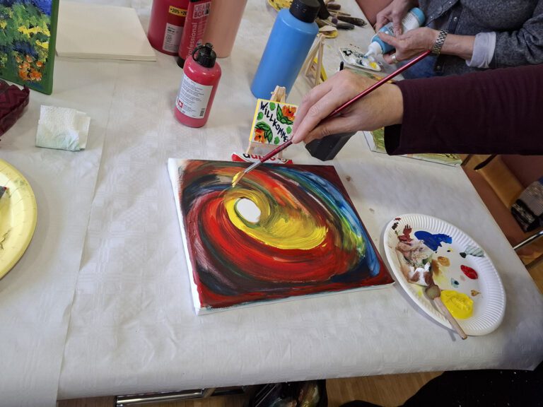 - Kreativer Mal-Prozess (60 Min.) – Umsetzung der Ideen auf der Leinwand