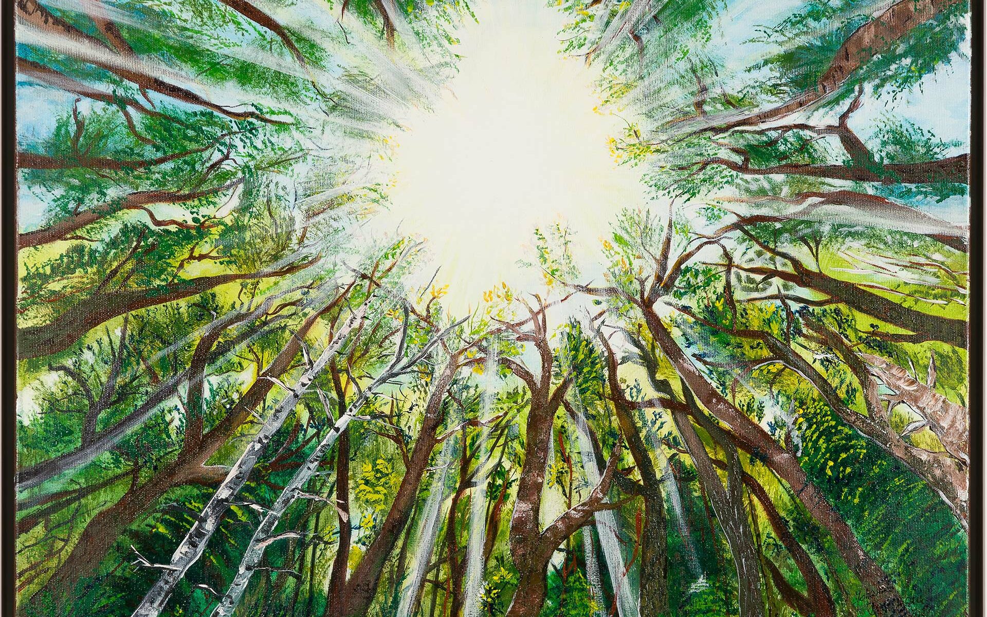 Das Bild zeigt eine Perspektive, die uns tief in den Wald eintauchen lässt, wo die mächtigen Bäume ihre Zweige in Richtung Himmel strecken. Diese Perspektive ist nicht zufällig gewählt – sie lädt uns ein, den Kopf zu heben und nach oben zu blicken, genau wie die Bäume, die sich dem Licht entgegenstrecken. Das strahlende Licht in der Mitte des Bildes symbolisiert das Göttliche, das uns stets umgibt, auch wenn es manchmal durch die dichten Blätter des Lebens verdeckt wird.